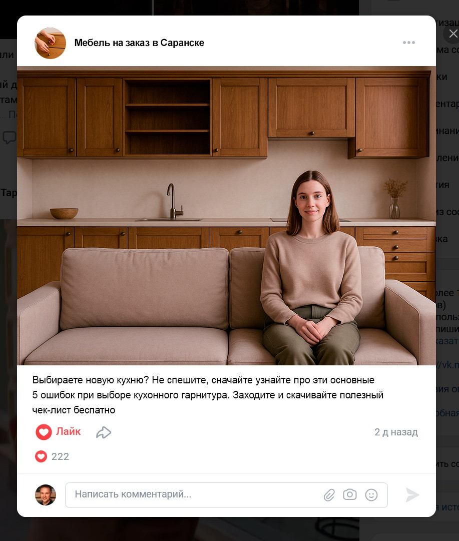 Сообщество должно быть «витриной», а не складом случайных фото. В Саранске мебельщики часто выкладывают просто фото изделий. Это не