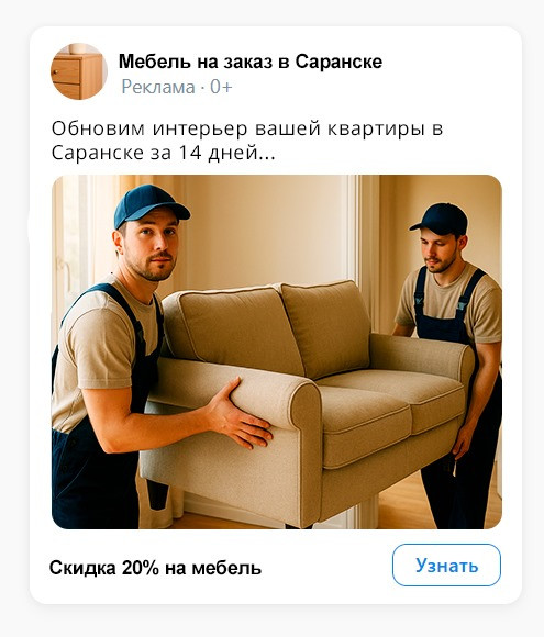 → заявки перестали «сгорать». · Бюджет: 20 000 ₽ за месяц. · Получили: 140 заявок. · В сделки вышло: 35 клиентов. · Средний чек: 40 000 ₽. · Выручка: 1 400 000 ₽. То есть реклама окупилась более чем в 7 раз. Чтобы продавать мебель через ВКонтакте в Саранске, нужно: 1. Определить