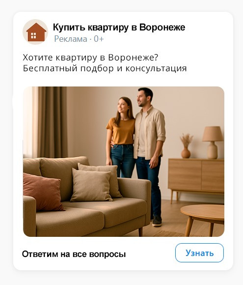 креатив: видеообзор квартиры (30 секунд) + текст «Хотите квартиру в Воронеже?