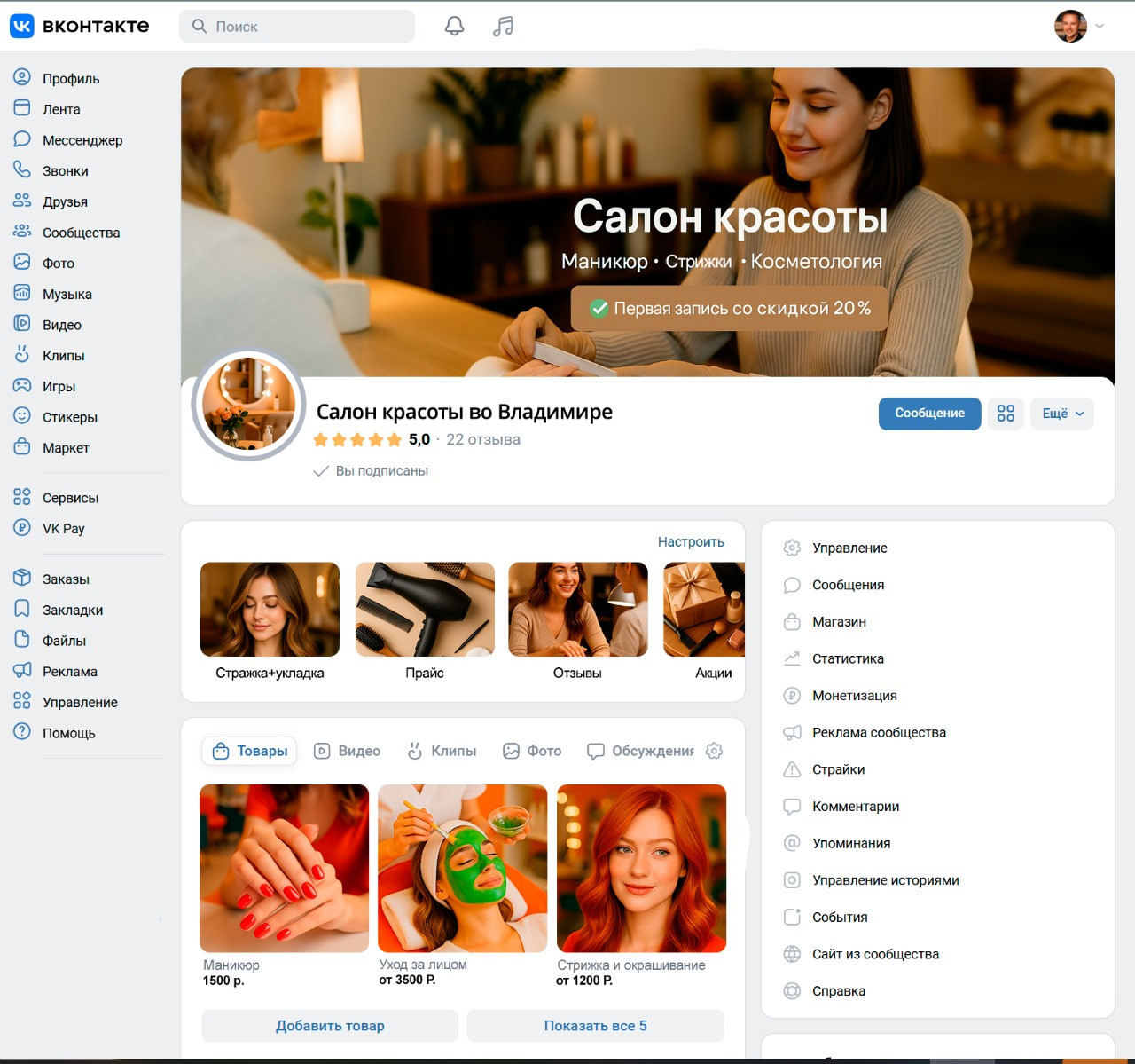 · Раздел «Товары в сообществе ВК» — оформили каждую услугу: маникюр, окрашивание, массаж, косметология.