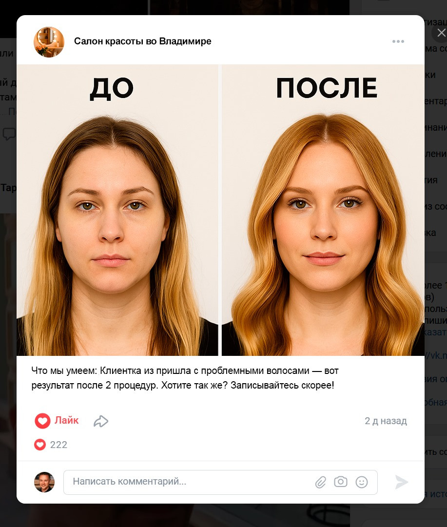 фото клиента «до/после» + текст «Салон красоты во Владимире. Первое посещение —