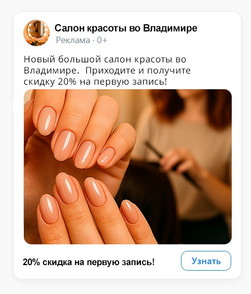 · Обложка с оффером: «Салон красоты во Владимире — маникюр, волосы, косметология. Первая запись со скидкой 20%».