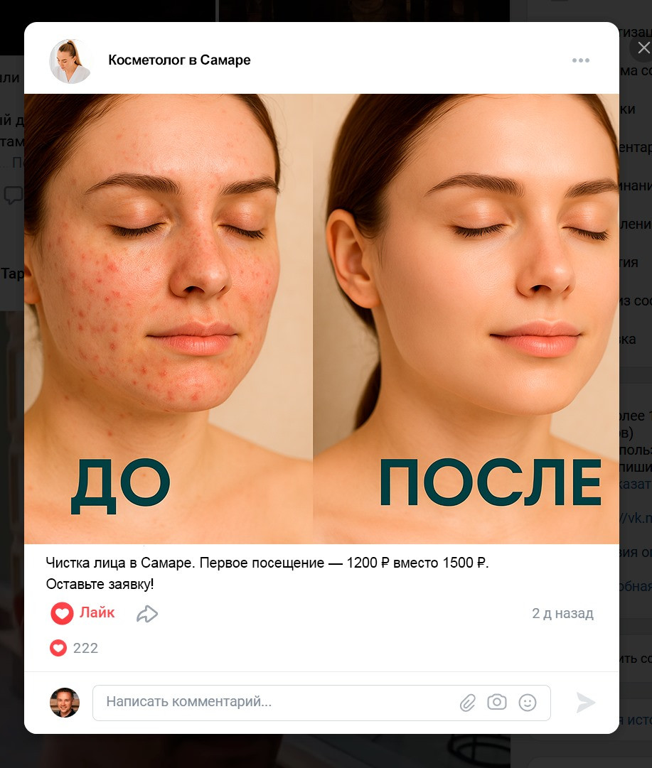 фото «до/после» + подпись «Чистка лица в Самаре. Первое посещение — 1200 ₽