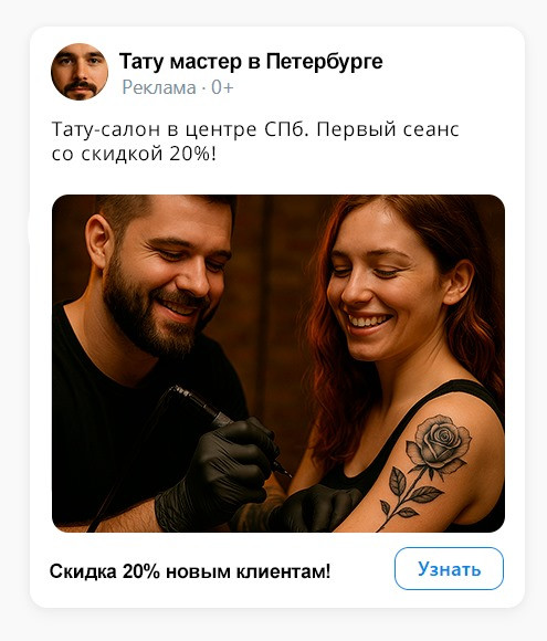 · Обложку с оффером: «Татуировки в Санкт-Петербурге — первый сеанс со скидкой 20%».