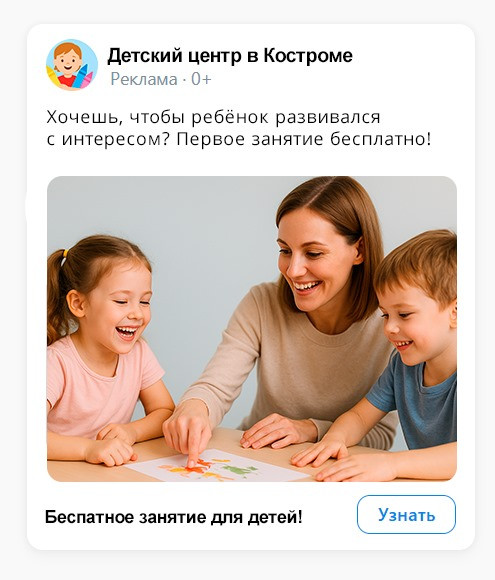· Обложку с оффером: «Детский центр в Костроме — развивающие занятия для детей 3–10 лет. Первое занятие бесплатно».