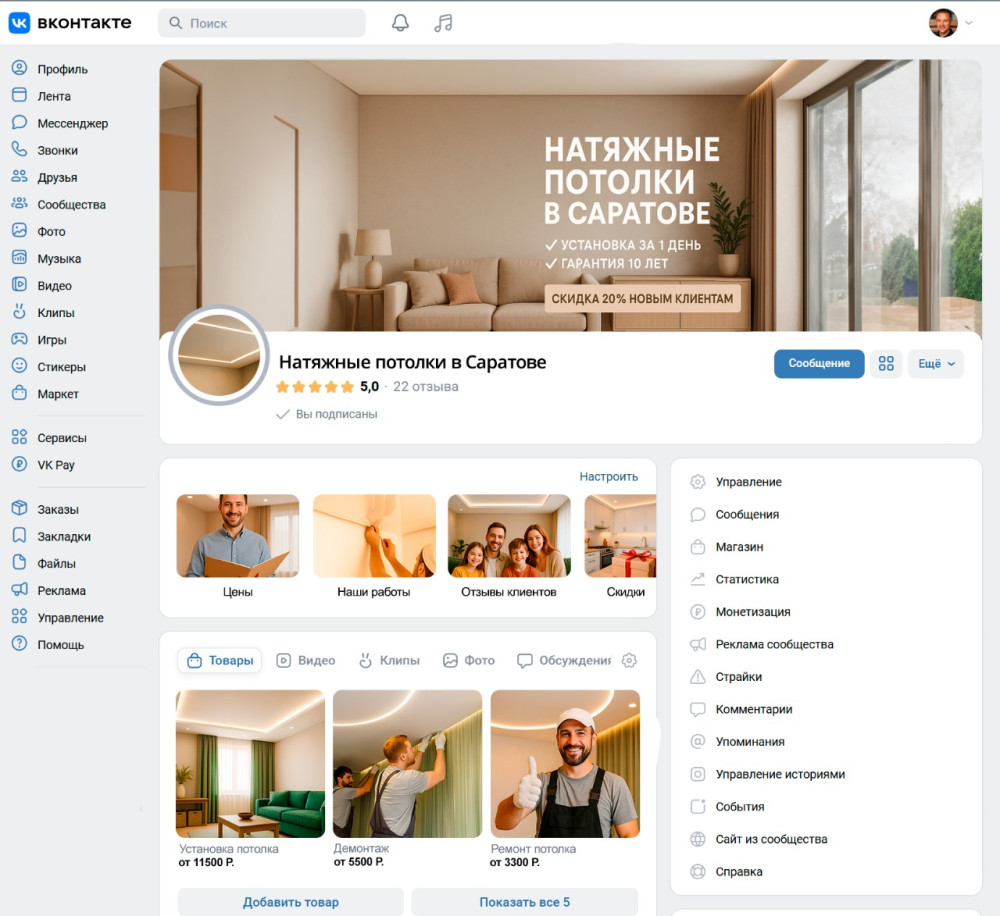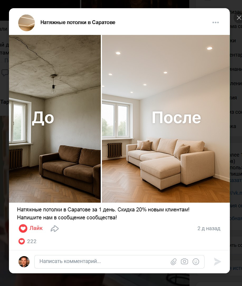 натяжных потолков через ВКонтакте в Саратове работает, если: 1. Определить целевую аудиторию. 2. Упаковать сообщество как шоурум. 3. Делать контент с «до/после» и