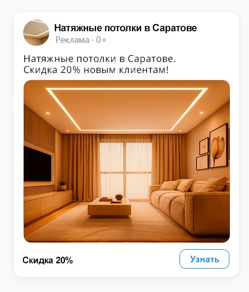 · Обложку с оффером: «Натяжные потолки в Саратове — установка за 1 день, гарантия 10 лет».