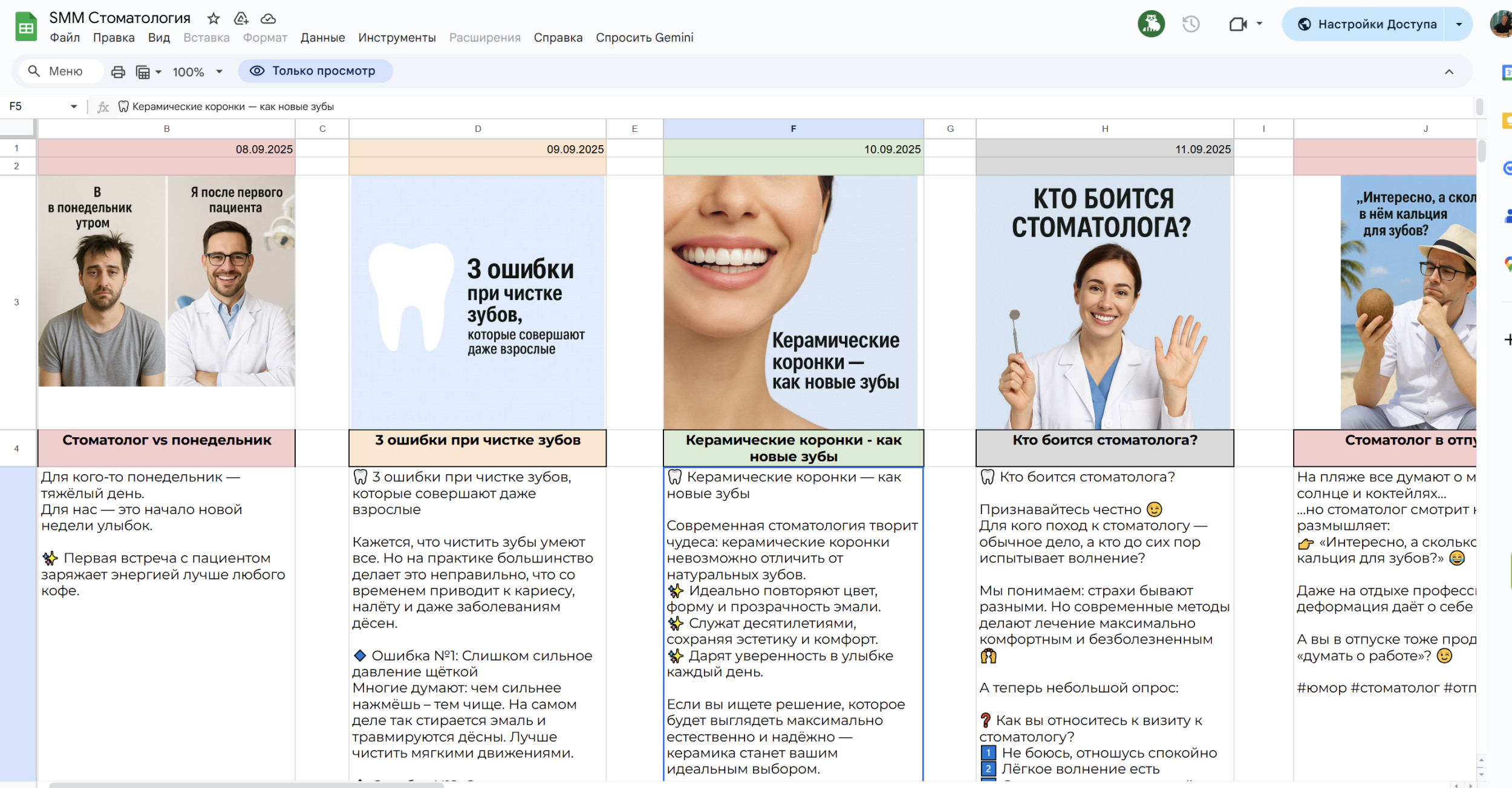 Пример подготовки контента на месяц для стоматологии, сначал все согласовываем в таблице, потом посты идут в публикацию