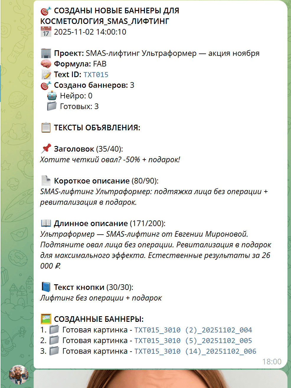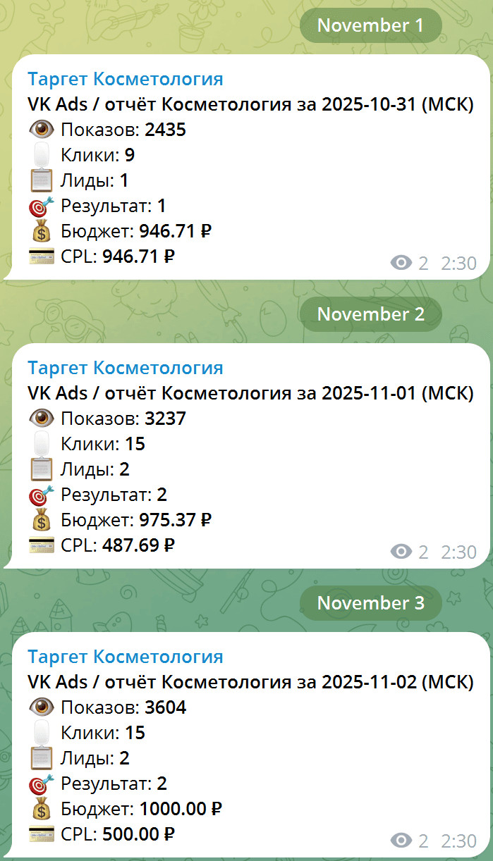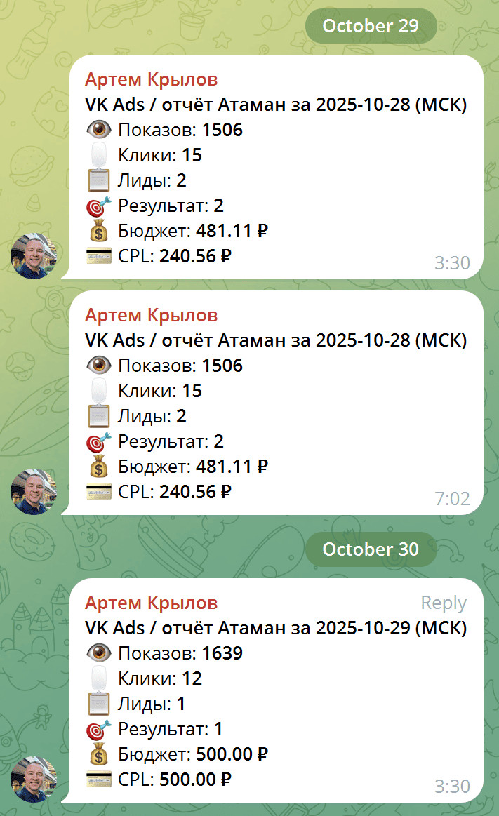 Она не просто запускает объявления. Она анализирует эффективность, отключает слабые креативы, создаёт новые, тестирует тексты и картинки, и каждый день шлёт отчёт в Telegram: сколько было кликов, сколько заявок и какая цена лида.