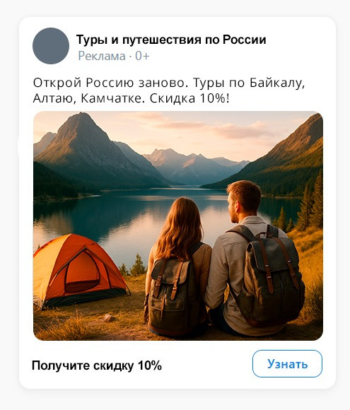 • Обложку с оффером: «Туры по России — путешествуйте легко! Скидка 10% новым клиентам».