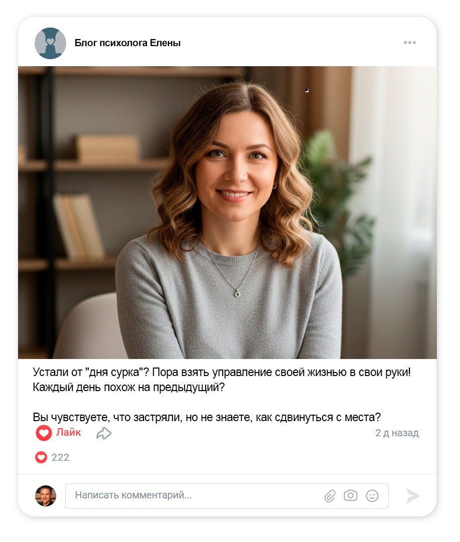 Сложность в том, что психологам нельзя продвигаться как обычному бизнесу. Нельзя обещать чудес, давить на страхи и «продавать в лоб». Важно говорить бережно и этично — а значит, нужен специалист (или система), который умеет писать так, чтобы человек чувствовал безопасность и доверие. Именно это чаще всего приводит к главному: люди начинают писать и записываться.