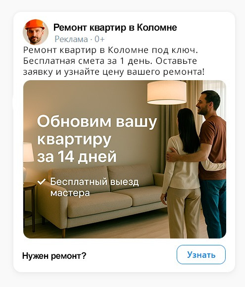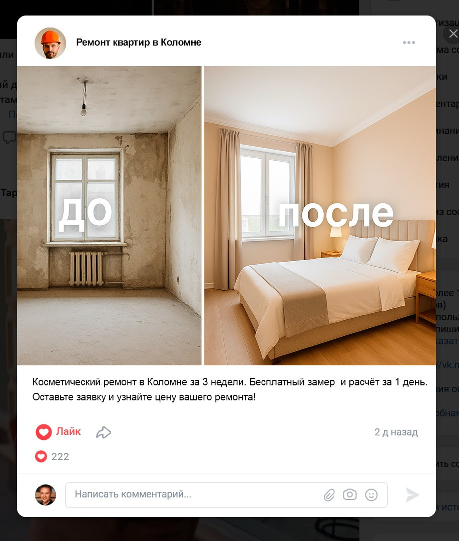 В ремонте клиент покупает не плитку и не шпаклёвку. Он покупает спокойствие: что всё будет по договору, понятно по этапам, без сюрпризов в цене и с нормальной коммуникацией. И если ваш ВК этого не показывает, то вы для него «ещё одна бригада в ленте».
