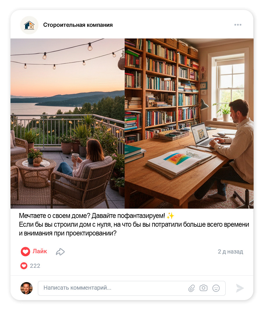 добавляете сами: фото/видео с объектов, отзывы, сторис «что сделали сегодня». · Регулярность без выгорания · Быстрый запуск контента · Заметно дешевле специалиста · Удобно, когда нет времени «писать посты» · Нужна первичная настройка и контроль 15–30 минут в