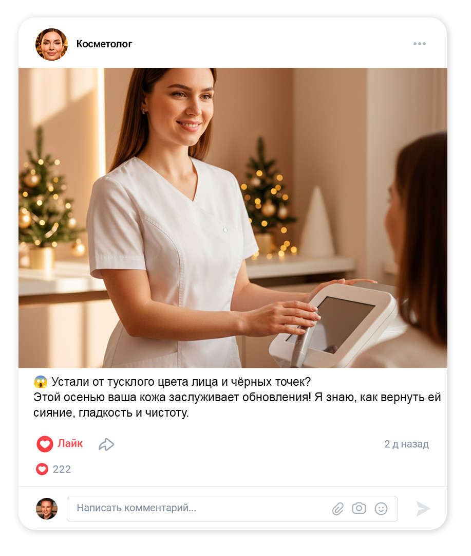 Косметолога выбирают головой: человеку важно понять, что всё безопасно, стерильно, вы объясняете и не навредите. Поэтому SMM — это контент + доверие + понятный путь к записи.