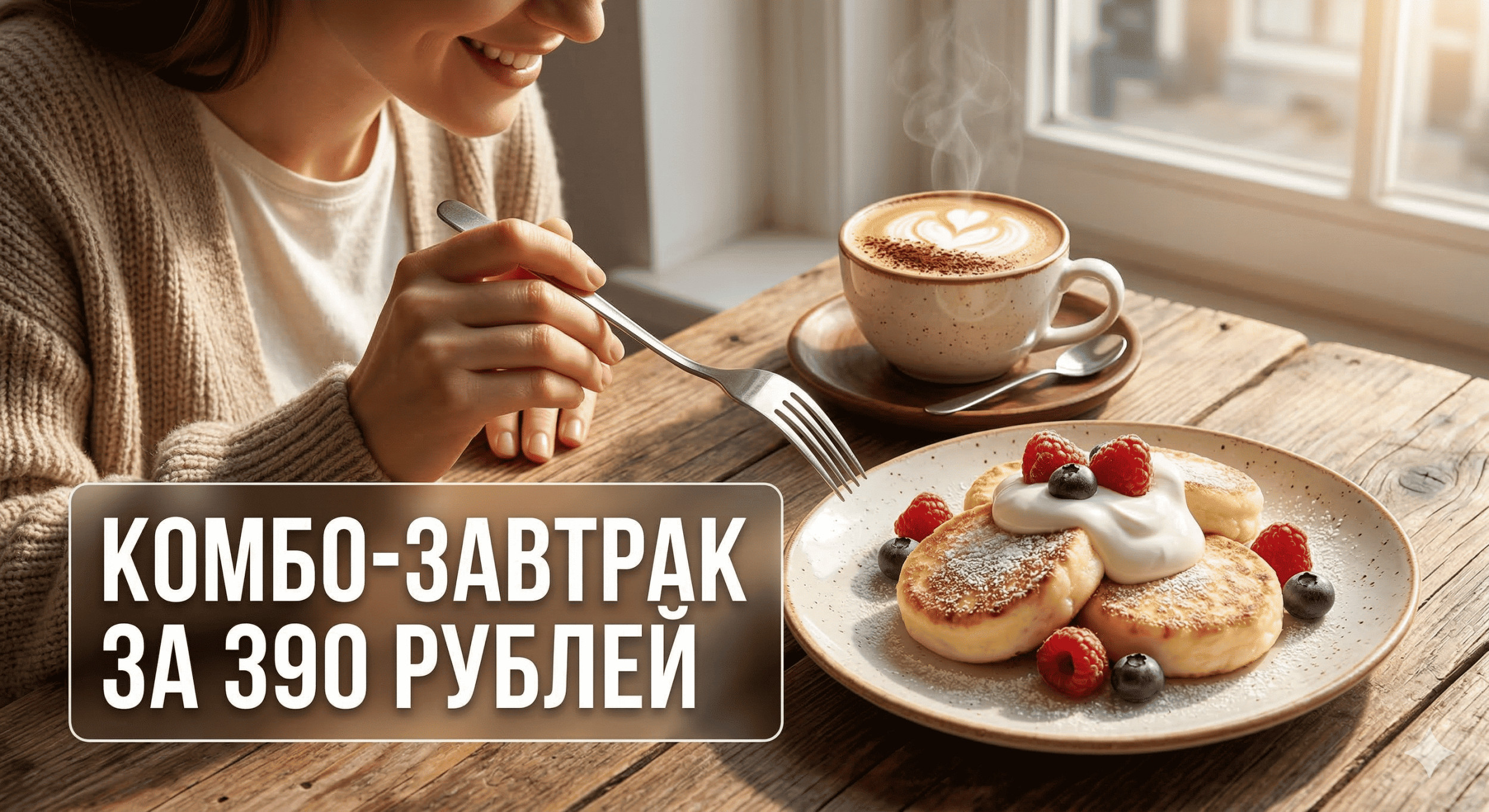 домом. Комбо-завтрак: нежные сырники со сметаной + капучино всего за 390
