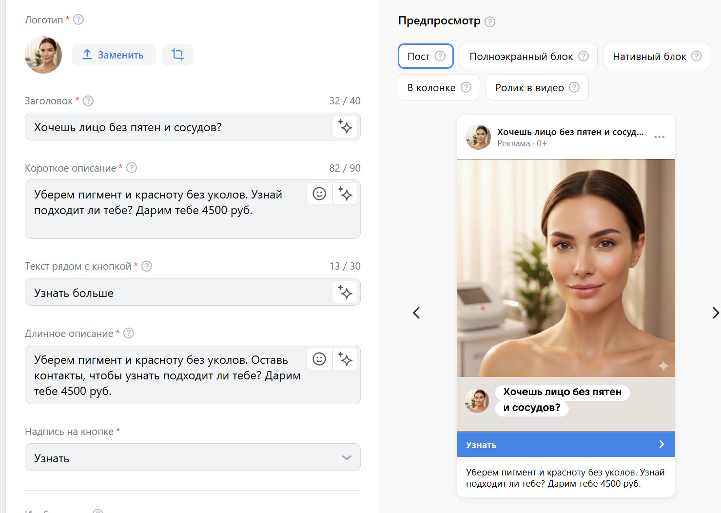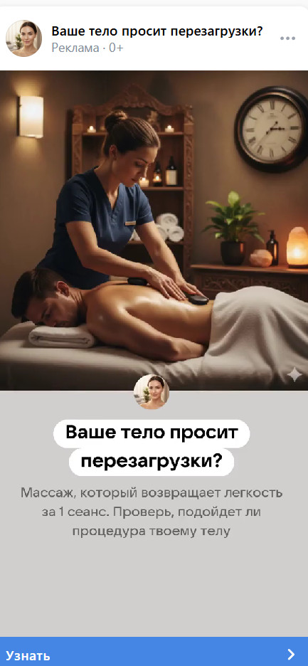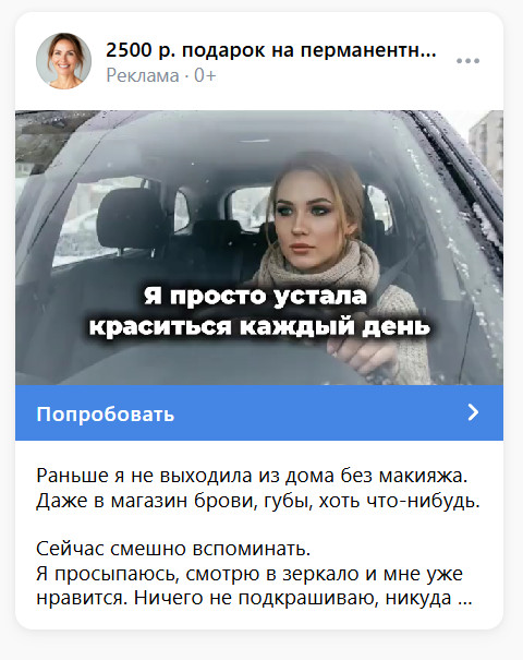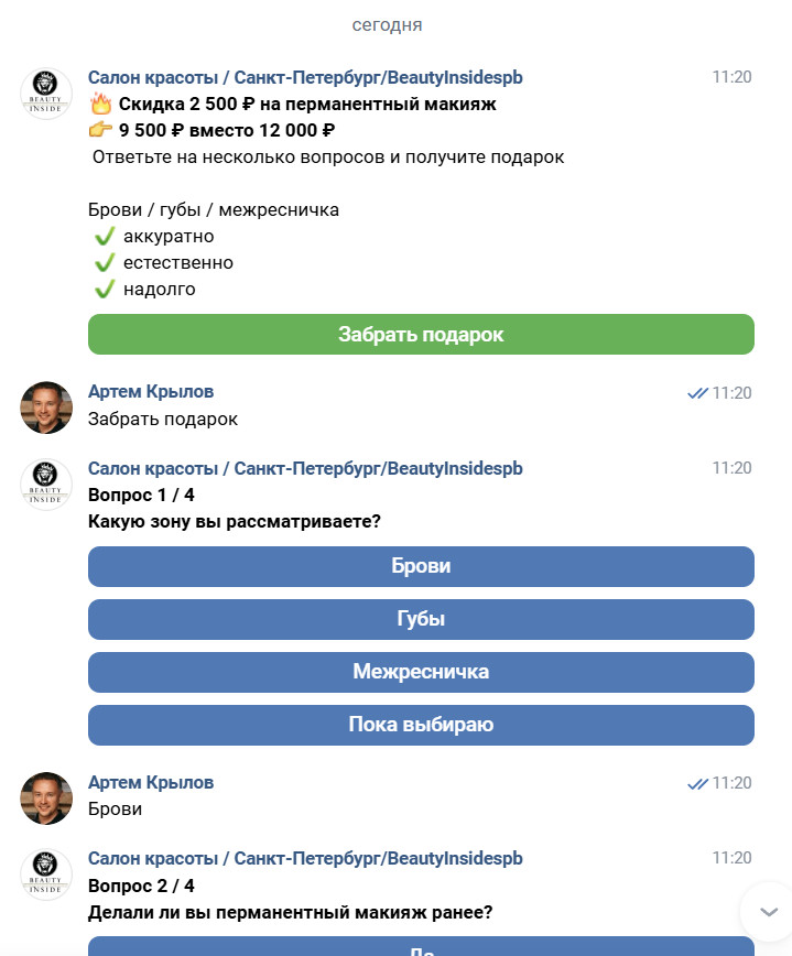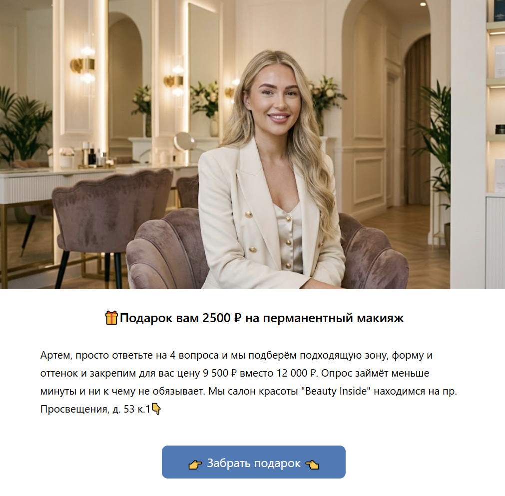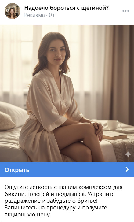 Но самое интересное произошло во втором месяце работы. В январе цена заявки была примерно 1246 рублей. А уже в феврале мы снизили её до 700 рублей. Для бьюти-сферы это очень хороший результат. Такое снижение произошло не случайно. Это результат нескольких изменений в рекламе. Мы поменяли креативы, точнее начали активно тестировать новые. Немного по-другому выбрали аудиторию и сфокусировались только на тех услугах, которые реально интересны людям. Самой сильной услугой оказался перманентный макияж. Именно она принесла основную часть заявок. По одной из рекламных кампаний получилось 21 заявка по цене около 568 рублей. Причём лучше всего здесь сработал формат коротких видео клипы ВКонтакте. Когда я делал креатив, я думал не про саму процедуру, а про проблему клиента. Многие женщины устали каждый день тратить время на макияж. Это и стало основной идеей рекламы. Смысл креатива был очень простой. Надоело краситься каждое утро сделай перманентный макияж и забудь об этом. Плюс мы добавили понятное предложение. Не просто «приходите на процедуру», а конкретную выгоду скидку 2500 рублей на первый визит. Ещё один важный момент география показа рекламы. Мы не пытались охватить весь город. Реклама показывалась только людям, которые находятся рядом с салоном, примерно в радиусе 2-3 километров. Для локального бизнеса это работает намного лучше. Очень многие недооценивают этот момент. Но он напрямую влияет на количество заявок. После клика человек попадает не сразу к менеджеру, а в небольшого бота ВКонтакте. Там его встречает простая страница с предложением. Например: перманентный макияж любой зоны за 9500 рублей вместо 12500. Дальше человек проходит небольшой квиз. Бот задаёт несколько простых вопросов: какую зону хочет сделать, делал ли процедуру раньше, когда планирует записаться. После этого бот отправляет заявку менеджеру салона. Уведомление приходит также мне и руководителю салона, чтобы мы видели все новые обращения. Так заявки не теряются и менеджеры могут быстро связаться с клиентом. Интересная ситуация получилась с другой услугой фотоомоложением. Обычно в рекламе ВКонтакте лучше всего работают видео. Но здесь наоборот, лучше сработала обычная фотография. В рекламе был очень простой смысл: убрать пигментацию и покраснения без уколов и сложных процедур. Мы не пытались сразу продать услугу. Вместо этого предложили человеку узнать, подходит ли ему такая процедура. Это выглядит намного мягче и вызывает меньше сопротивления. Плюс добавили подарок на первый визит скидку 4500 рублей. Такой формат рекламы тоже начал приносить заявки. Ещё одна услуга, которая приятно удивила массаж. По некоторым объявлениям заявки получались примерно по 300 рублей. Для бьюти-сферы это очень дешёвый лид. Креатив был максимально простой. Никаких сложных формулировок. Основная идея массаж, который возвращает лёгкость телу всего за один сеанс. И предложение пройти небольшой опрос, чтобы понять, подходит ли процедура. Дальше всё работает по той же схеме: человек проходит несколько вопросов, получает подарок и оставляет заявку. Важно понимать, что в рекламе не всё работает одинаково. Например, мы пробовали запускать рекламу на лазерную эпиляцию. Но там заявки получались слишком дорогими. В итоге эту кампанию пришлось отключить. Это нормальный процесс. Реклама то всегда тес