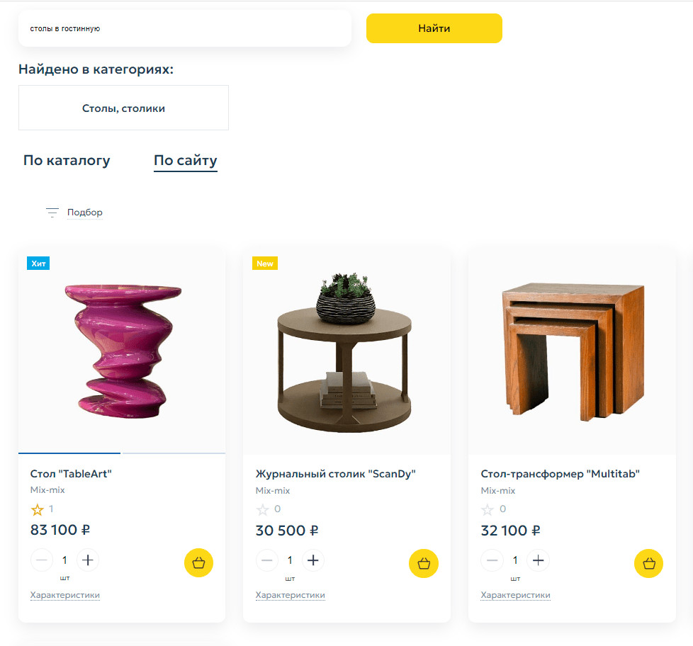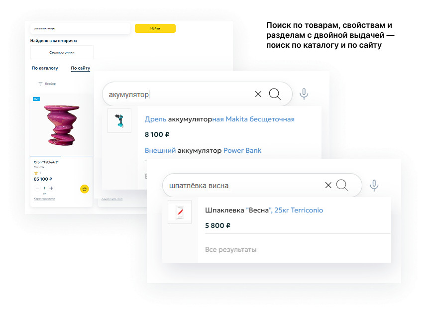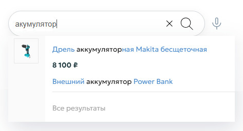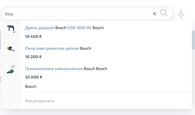 Удобство и точность — снижается вероятность того, что покупатель не найдёт нужный товар из-за ошибок в запросе. Поиск по общим для типа товара синонимам. Например: «дрели» по запросу «инструмент» Поиск по названиям связанных меток товаров Например: Пользователи могут использовать разные способы написания слов, особенно если это иностранные бренды или термины. Например, при поиске «laptop» или «lap top», пользователи могут писать это с пробелом или без него. Если поиск исправляет такие вариации, это также улучшает точность и полноту результатов. Покупатели часто вводят запросы, не соблюдая строгую структуру. Например, они могут писать короткими фразами, использовать аббревиатуры или сокращения. Поиск, исправляющий опечатки, помогает правильно интерпретировать такие запросы, даже если они не следуют грамматическим или орфографическим правилам. Когда пользователь начинает вводить запрос, умный поиск автоматически покажет релевантные подсказки даже если слово введено не полностью, включая: Снижение числа вводимых символов помогает ускорить процесс поиска. Разработали и внедрили собственный алгоритм исправления опечаток более адаптированный для интернет-магазинов и русского языка по сравнению с алгоритмами англоязычного алфавита. Добавляйте информацию по каким синонимам находить товар. Система поиска сможет точнее найти и показать нужные товары. Для более точного поиска можно добавлять различные способы написания слов, общераспространенные названия, профессиональные жаргонизмы. Просто добавьте всё нужное в свойство товара «Синонимы для поиска». Например, «микроволновка» для «микроволновая печь». Поиск производится не только по названию товара, но и по его свойствам или свойствам торгового предложения. Добавляйте в поиск артикул, код товара, цвет и т.д. — необходимый Вашему бизнесу набор свойств, участвующих в поиске, стандартно для 1С-Битрикс в панели управления свойствами. Например: Пользователь может не только набирать запрос, но и использовать голосовой ввод. Голосовой поиск значительно упрощает процесс поиска товаров и информации на сайте, особенно для людей, которые предпочитают не вводить текст вручную. Пользователи часто ищут товары на мобильных телефонах, и голосовой поиск позволяет им делать это быстрее, чем набор текста. Голосовой поиск ускоряет процесс нахождения информации на сайте, особенно когда пользователи знают, что они ищут, и могут быстро проговорить запрос. В условиях ограниченного времени или многозадачности голосовой поиск ускоряет взаимодействие с сайтом, позволяя: Пример: За несколько секунд покупатель может найти нужный товар, скажем, «черные ботинки для женщин», вместо того чтобы потратить время на ручной поиск. Голосовой поиск способствует более активному вовлечению пользователей — голосовые запросы часто более естественные и разговорные. Это может улучшить восприятие бренда как более «человечного» и доступного. Такой поиск позволяет формировать более точные запросы, что может снизить вероятность ошибок и разочарований пользователей из-за неправильных результатов поиска. Фильтр найденных поиском товаров по разделам, формируемый автоматически, поможет пользователю сузить область поиска. Покупатель не теряет время на ненужные результаты. Ускорение процесса покупки — с филь
