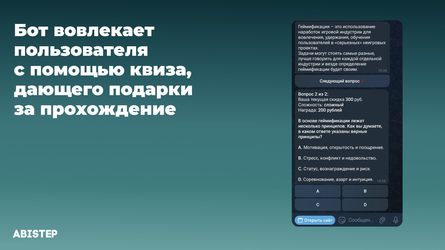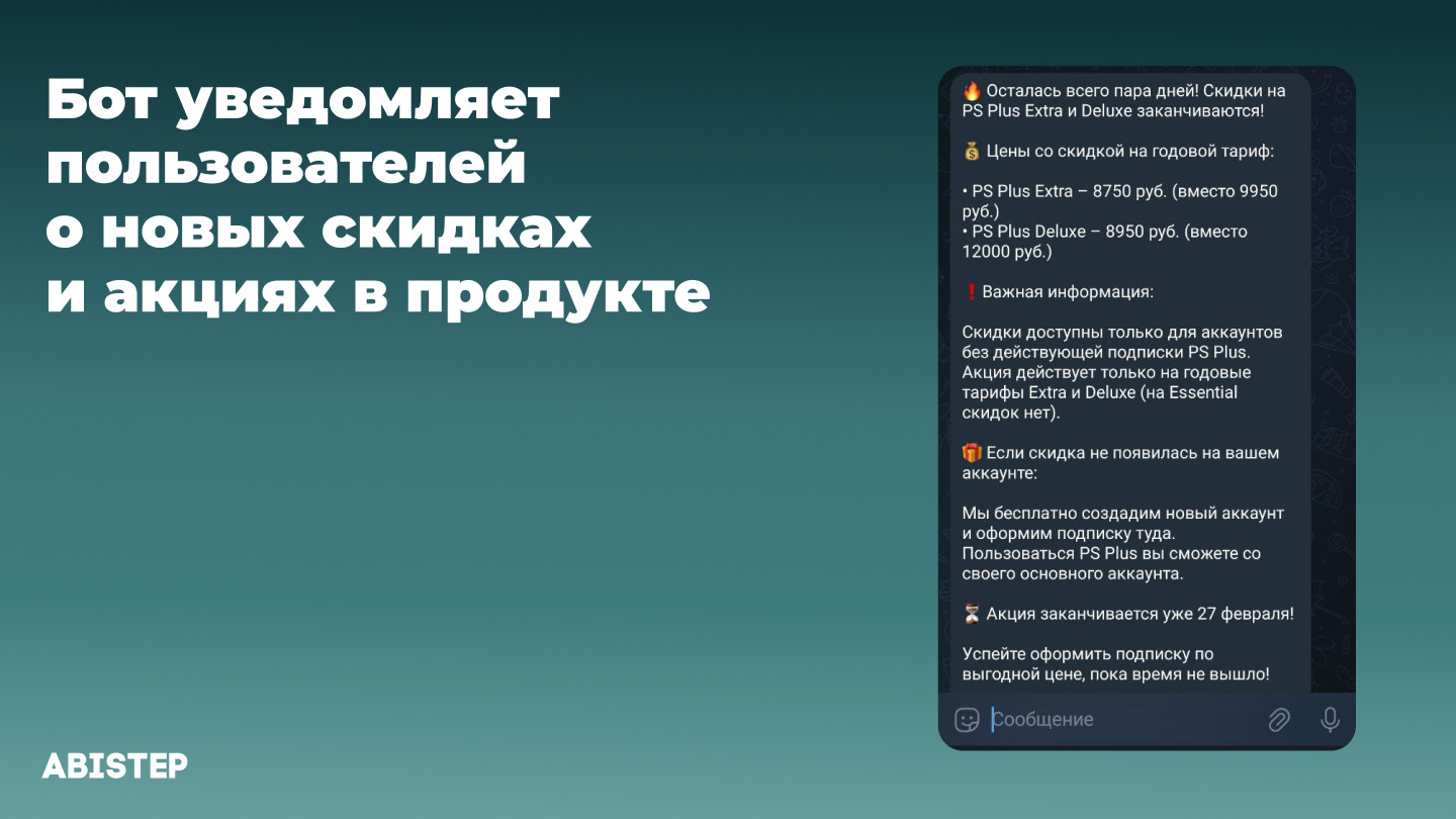 Это не просто RPA (Robotic Process Automation) в классическом понимании, где роботы не имеют «интеллекта», их действия ограничены набором правил и сценариев, заранее запрограммированных людьми. ИИ же способен выполнять более сложные и гибкие задачи, требующие «умственных усилий». Он может имитировать процессы человеческого разума, такие как обучение, восприятие, принятие решений на основе данных, интерпретация контекста. В Abistep мы не предлагаем «единое ИИ-решение для всего бизнеса». На первом этапе мы выявляем 1-2 точки давления: Внедрение занимает от 10 рабочих дней. Далее — замер ключевых метрик: → количество автоматически обработанных заявок, → снижение затрат на единицу обработки, → изменение конверсии на этапах воронки. Только после подтверждения эффекта принимается решение о масштабировании. ИИ уже здесь — не как технология будущего, а как инструмент настоящего: для реального снижение издержек и ускорения циклов в вашем бизнесе — запускаем, измеряем, масштабируем. Особенно эффективен он там, где процессы повторяются, данные структурированы, а решения принимаются по чётким правилам. Для бизнеса это означает: Внедрение такого решения — это инвестиция, которая окупается многократно. Оставьте заявку на разработку Telegram-бота на нашем сайте и начните трансформировать ваш бизнес уже сегодня!