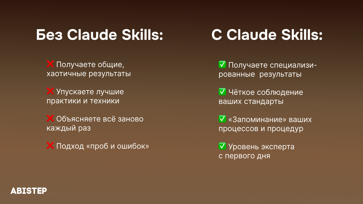 Claude обладает широкими знаниями, но не знаком с вашими бренд-гайдами, внутренними форматами документов и отраслевыми процессами. Skills закрывают этот разрыв, передавая ИИ: