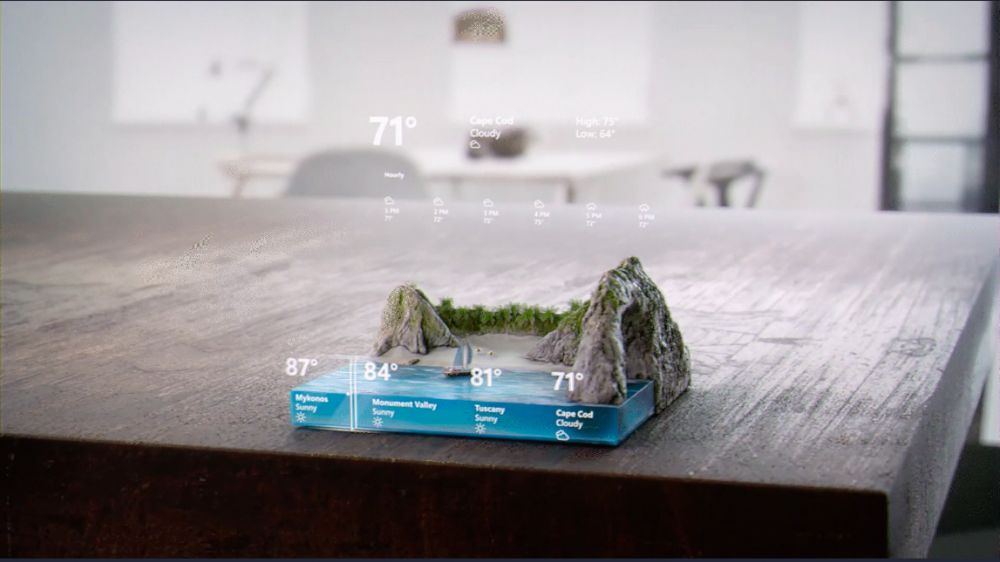 Проект стартовал в мае, холодное и сырое время здесь, в районе Сиэтла, поэтому у нас на уме всегда были солнечные прибрежные места. Мы немного поэкспериментировали с целью найти правильную шкалу и уровень детализации для создания четырех атмосферных диорамов в HoloLens: Tuscany, Mykonos, Cape Cod, и Monument Valley. Таким образом мы смогли создать новый миниатюрный мир в вашей повседневной среде. Здесь вы можете взаимодействовать с объектами - они приспосабливаются по мере вашего приближения и движения вокруг. Наша главная цель здесь - вовлечение. Вы начинаете с уровня информационной архитектуры: какая температура в Тоскане (Tuscany)? Затем мы приглашаем вас. Приблизьтесь к местности. Теперь вы видите свет и атмосферу. Далее - подробное движение и пространственные звуки. Теперь - повествовательные детали. Кто-то машет вам рукой, деревья качаются.