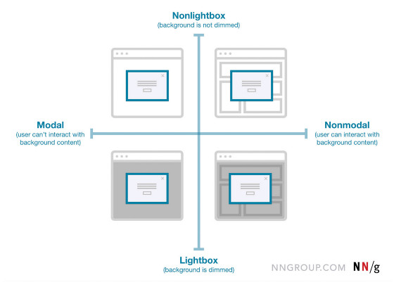 С точки зрения анатомии попапов модальные наложения отключают доступ ко всему фоновому контенту, немодальные оставляют пользователям возможность взаимодействовать с ним, а лайтбоксы затемняют фоновый контент.