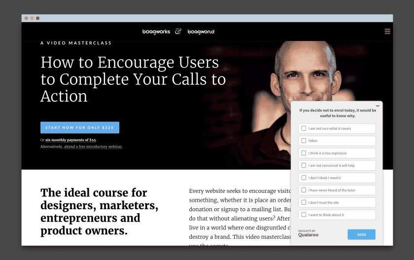 Первая часть описывает пользу, а вторая — способ её достижения. Однако будьте осторожны. Ваше ценностное предложение может легко превратится в бессмыслицу. Например, говорить о «лучшем в своём роде» или «дружелюбном и доступном» — это пустые слова, которые может затирать абсолютно любая компания. Чтобы не стать серой массой, спросите себя, а не будет ли, случайно, правдивым противоположное вашему предложение? Например, если вы говорите: «Мы предлагаем высокое качество по доступной цене» То реверс был бы примерно таким: «Мы предлагаем ужасное качество с космическим ценником» И наоборот, если вы написали: «Мы предлагаем товары ручной работы для требовательного покупателя» Противоположность была бы похожа на что-то такое: «Мы предлагаем продукцию заводского производства для массового рынка» Ценностное предложение не обязательно должно состоять только из одного предложения. Составьте список всех ваших преимуществ, а затем перечислите всевозможные предложения. Каждый лендинг, очевидно, нуждается в призывах к действию. Это означает, что вы должны спросить себя, какое целевое действие вы хотите получить от пользователей? Чтобы конкретизировать целевую страницу и повысить вероятность действий пользователей, не предлагайте слишком много призывов. Например, просьба фоловить вас в социальных сетях просто-напросто отвлечёт клиентов от выполнения основного действия. Но, так или иначе, в некоторых ситуациях будет иметь смысл вторичный призыв к действию. Если вы сделали всё правильно, ваш лендинг убедит многих пользователей приобрести ваш продукт. Но всегда найдутся те, кто будет к этому не готов. Вместо того, чтобы забиться в угол и начать плакать, стоит предложить им вторичный стимул к действию, который требует меньше обязательств. Например, если ваше целевое действие — совершить покупку, дополнительное может быть простой просьбой о подписке на рассылку новостей. Чтобы оно не отвлекало, убедитесь в его небольшой заметности. То есть оно может находиться в футере или прямо в диалоговом окне, которое появляется при выходе с сайта. Но будьте осторожны с всплывающими окнами, потому что некоторые пользователи крайне негативно реагируют на такого рода рекламу. В конце концов подумайте о том, как именно вы собираетесь стимулировать людей к действию. Можно предложить бесплатную электронную книгу, если люди подписываются на рассылку, или какую-то скидку, если они совершают покупки через ваш лендинг. Иногда что-то маленькое и, на первый взгляд, невзрачное может стать тем самым толчком, который заставит действовать сейчас, а не когда-нибудь потом. Конечно, подарок не будет иметь никакого значения, если другие элементы будут отпугивать клиентов. Необходимо понять, в чём заключаются проблемы и найти способ их решения. Это известно как обработка возражений. По каким причинам человек может перестать делать что-либо на вашем лендинге? А платна ли доставка, или может они беспокоятся о своей конфиденциальности? А может у конкурентов дешевле? Если вам трудно составить список возражений, которые могут возникнуть у пользователей, в таком случае необходимо провести исследование, чтобы выяснить это. Не думайте, что это будет дорого и займёт много времени. Всё, что вам нужно — это всего один вопрос на вашей целевой странице. Если люди уходят с ваше