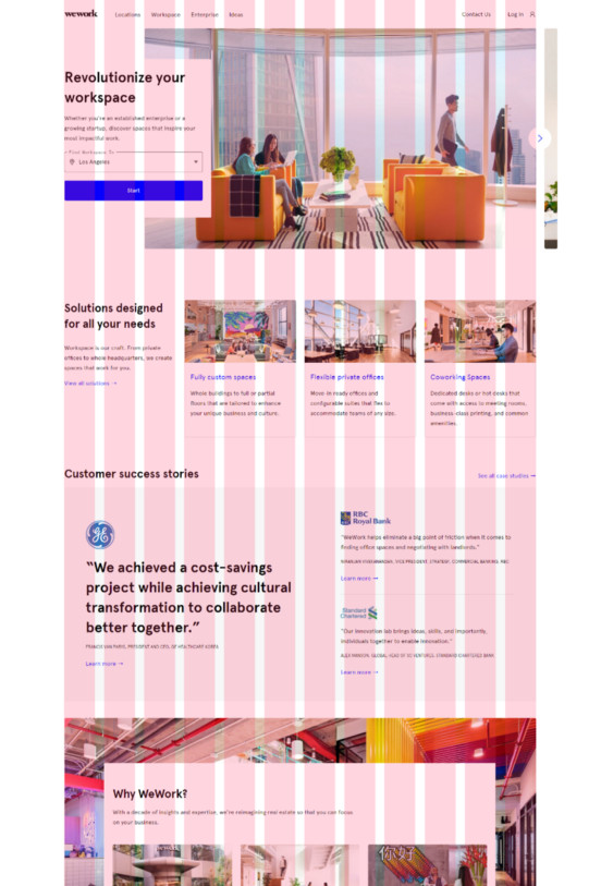 Ака макет всей страницы. Это самый простой макет, который используется для лендингов. У вас есть место для больших изображений, которые могут рекламировать ваш продукт или бренд. Элементы, находящиеся внутри вашей одностолбцовой разметки действуют как отдельные модули, из-за чего их можно легко масштабировать на мобильных устройствах, потому что всё, что нужно, уже расставлено в необходимом для вас порядке. Поскольку такой макет мощен для провоцирования эмоций, он является обобщённым вариантом для домашних страниц, страниц «О нас», практических рекомендациях, новых продуктов и т.д. В общем и целом макет состоит из 12 столбцов для основного контента. Отчётливо видно, что WeWork использует сетки в своих проектах, потому что все элементы выстраиваются в линию, несмотря на то, что они разделены пустыми строками. Лёгкая подача заключается в том, что количество отступов между элементами одинаково, а внешние края имеют одинаковую ширину, что делает этот дизайн очень приятным для глаз. Вот несколько примеров разметки одной колонки. Обратите внимание, как дочерние элементы внутри родительского могут быть разделены на разные столбцы, но родительский всё так же находится в одном основном контейнере. Один из самых распространённых макетов просто потому, что вам не нужен текст шириной более 6–8 столбцов. Другое преимущество заключается в том, что можно разместить другие элементы гораздо выше сгиба и использовать боковой столбец для навигации, рекламы, призыва к действиям и т.д. Вы должны использовать 8 столбцов для основного контента и 4 столбца для второстепенного. «8 столбцов? Но ведь тогда у меня будет гораздо меньше места для дизайна!», — могли бы сказать вы. В Интернете нельзя позволять тексту занимать все 12 столбцов. Это основной типографский принцип, при котором удобная ширина чтения составляет около 60–80 символов при 16 пикселях, а на десктопе — не более 8 столбцов. Даже в одностолбцовых лендингах объекты располагаются по центру и имеют максимальную ширину. Так что на самом деле «мало места» не является проблемой и даже сделает ваш дизайн лучше. Эта разметка очень универсальна и подходит для внутренних страниц сайта, например, когда у вас есть много текста для чтения. Примерами являются блоги, инструкции, часто задаваемые вопросы, гайды, или другие полезные вещи для пользователя. Поскольку вы имеете дело с тремя столбцами, соответственно у вас есть выбор, что и куда распределить. Вначале рассмотрим простой пример — чётное распределение 4—4—4. Отличный вариант, когда вам нужно показать много изображений. Также подходит, если дизайн будет использовать максимальную ширину. Неравномерное распределение — разметка, когда у вас есть продукт с длинной прокруткой контента и другими вещами, доступными пользователю. Это удобно, когда основной контент не требует большого количества горизонтального пространства. Вот пример макета 3—6—3 с доски объявлений Dribble. Фиолетовый контур указывает, где на сетке находится содержимое, а фиолетовые блоки — на дополнительный отступ элемента. Мне очень нравится этот пример, потому что это своеоброзное напоминание о том, что вы можете разбить страницу как вам угодно. Здесь заголовок и большой CTA — это модуль, который работает как оператор заголовка перед тремя столбцами. Если присмотреться, то в центре мож