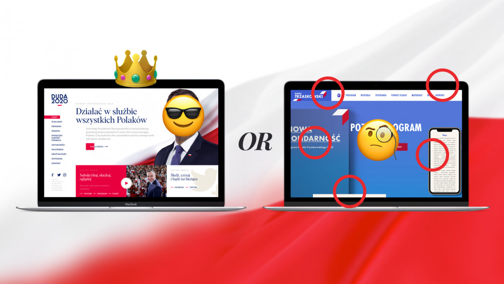 Посмотрите ниже. Какой из двух дизайнов привлекает ваше внимание больше? Вы видите, что именно тут не так? Рекламный щит слева принадлежит Анджею. Он смотрит на нас и слегка улыбается. Мы автоматически устанавливаем с ним зрительный контакт — здесь есть эмоциональная связь, что является очень важным фактором. К слову, мы с большей вероятностью запомним лица, с которыми у нас был установлен длительный зрительный контакт. Цвета здесь сильные. Контраст между элементами на билборде высок — мы легко можем отличить кандидата от фона. Сам по себе фон не отвлекает внимание от особы и слогана. Рекламный щит справа принадлежит Рафаэлю. Он не смотрит на нас, соответственно нет никакой эмоциональной связи со зрителем. Мы видим только половину его лица. Контраст между кандидатом и фоном слишком низкий — очень сложно сосредоточиться на чем-либо. Польский акцент (красно-белый флаг) едва заметен. Рекламный щит Рафаэля из-за плохих визуальных решений заставляет его выглядеть смущенным, запуганным и нерешительным. Из-за отсутствия контраста и эмоциональной связи, рекламный щит не привлекает внимание зрителя. Прежде чем мы начнем анализировать веб-сайты двух кандидатов, давайте посмотрим, что происходит, когда мы пересылаем ссылку на сайт (например, коллеге). Какой из «героев» кажется вам более привлекательным? Рафаэль (справа), имеет низкоконтрастное, вырванное из контекста изображение. Ни зрительного контакта, ни имени кандидата. На его место можно поставить кого угодно угодно и результат останется тот-же. И напротив, изображение Анджея (слева) — последовательно и привлекает внимание. Зрительный контакт (✓). Хорошая контрастность (✓). Имя кандидата (✓). Короткое, обнадеживающее «приглашение» на сайт (✓). Общая чёткость дизайна (✓). Это мелочи, но нет ничего важнее мелочей... Переходим к сайтам и скажу сразу, здесь начнутся настоящие проблемы. Слева сайт Анджея. Первая мысль — выглядит очень уютно. Здесь есть всё, что должно быть: фотография кандидата, зрительный контакт, элегантная, а главное четкая типографика, высокая контрастность, соответствующие пропорции между используемыми цветами, ощущение ясности и современности. Сразу можно сказать, что тут работал профессионал. Кое-что можно улучшить, но общее впечатление остаётся очень положительным. О, а справа сайт Рафаэля или нет? Так сразу и не ответишь, а всё потому что там нет даже его изображения. И это действительно беспокоит. Трудно представить, кто принял решение опубликовать сайт в таком виде. Практически каждая ошибка, которая могла быть здесь сделана — была сделана (это касается как UX, так и маркетинга). Нет фотографии кандидата, вместо неё представлена просто обложка его программы (книги). Но дело в том, что и она почти не видна, а все потому что обложка имеет тот же градиент, что и фон (здорово, правда?). Но вернемся чуточку назад. Зачем прятать парня? Рассуждая объективно, он весьма неплохо выглядит. Конечно, вы голосуете в основном за его программу и это не конкурс красоты, но все же неплохо было бы увидеть человека на его собственном сайте. В нашем же случае, здесь ничего не привлекает внимание! Контрастность — плохая. Какая-то обложка книги и парящий в случайных местах старый смартфон выглядят нелепо. Красный CTA на синем фоне попросту режет глаз. Типографика — хуже быть не может (возможн