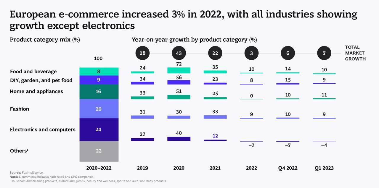 - Категория электроники начала падать в 2022м в Европе и продолжила падать в Q1 2023