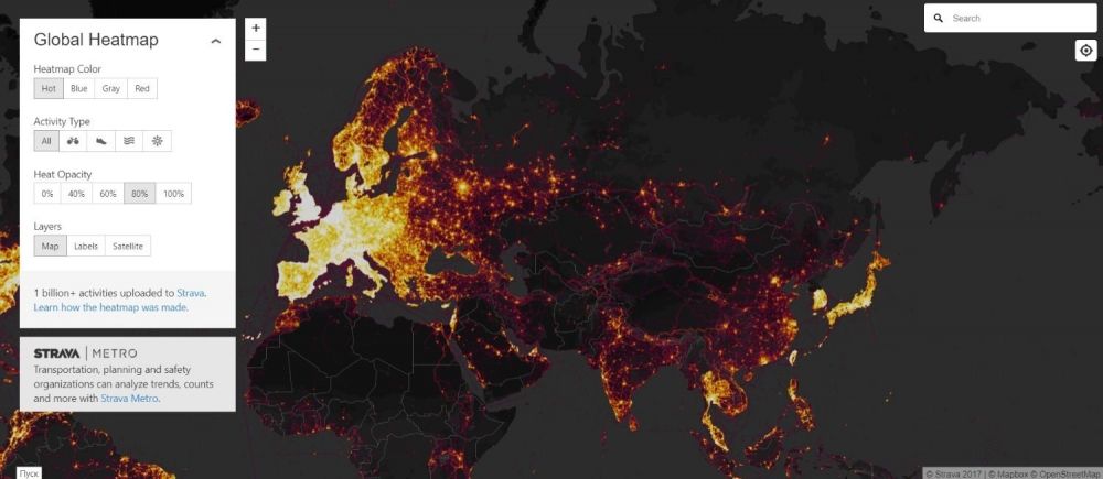Онлай-карта Strava Global Heat Map была представлена в ноябре 2017 года. Чтобы ее создать, использовались аналитические данные, которые собирались с 2015 по 2017 годы. Всего разработчики задействовали около миллиарда зарегистрированных в приложении тренировок и более трех триллионов точек на карте. Активность пользователей обозначена цветовыми индикаторами - чем популярнее территория маршрута, тем ярче она «подсвечивает» на карте.
