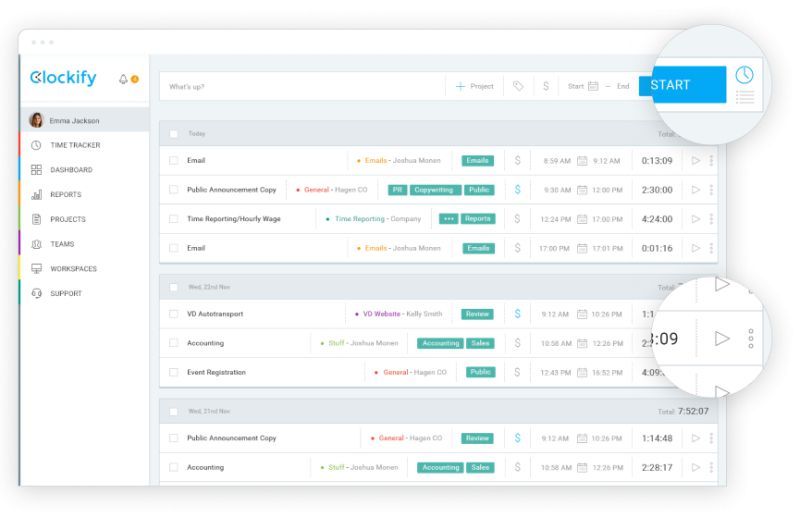 Clockify imeyet vse osnovnyye funktsii otslezhivaniya vremeni (takiye kak rezhim taymera i vozmozhnost' dobavlyat' vremya vruchnuyu), neskol'ko tipov otchetov i neskol'ko drugikh funktsiy.