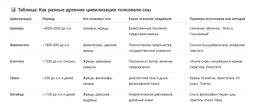 Во всех древних цивилизациях — от Шумера до Китая — сны воспринимались не как личный опыт, а как пророческие послания, приходящие от богов, духов или высших сил. Сновидения влияли на политику, религию, медицину и выбор личного пути. Разные народы создавали свои системы толкования снов, но объединяло их одно: глубокая вера в то, что сон — это больше, чем просто образ воображения.