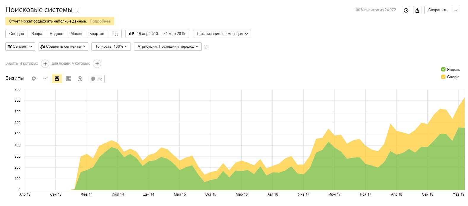 Трафик из поиска через 3 года работы Март 2019: 841 чел./месяц