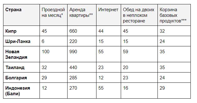Для вас мы собрали несколько самых распространенных локаций для релокейта фрилансера и сравнили стоимость жизни в них:
