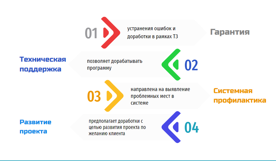 - техническая поддержка — предусматривает обновление ядра ПО, внесение доработок в программу и внедрение новых пожеланий заказчика в ходе эксплуатации уже запущенной программы;
