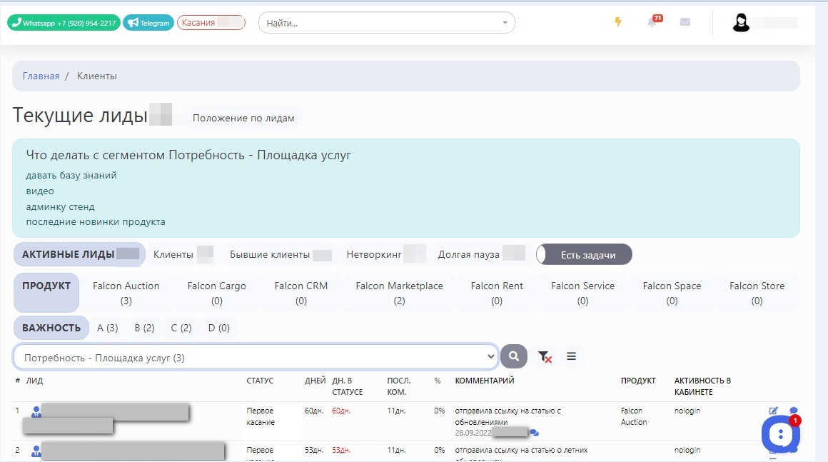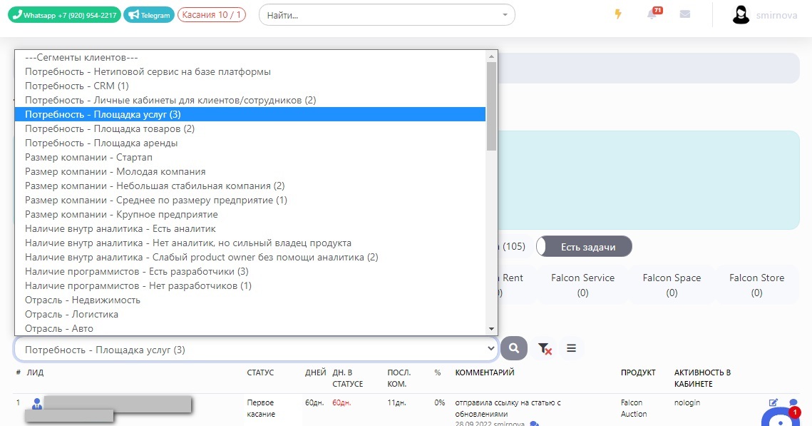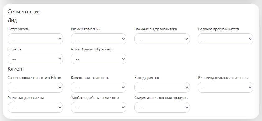 Вот так выглядит наш вариант сегментации в карточке клиента: В итоге у вас получается база существующих клиентов и клиентов потенциальных, имеющих точные характеристики, по которым их можно отбирать. Так, это все хорошо, но что это дает? Представьте, что вы когда-то покупали шины для автомобиля. И теперь вам названивают из магазина шин, чтобы вы купили еще шины для мотоцикла, для велосипеда и т.д. Вы понимаете, что вам это не нужно, и это вызывает отторжение. Почему так происходит? Потому что продавец не учитывает ваш контекст, ваши нюансы. Для него важно понять, что у вас есть (к каким сегментам вас отнести) и предлагать ТОЧЕЧНО, а не все подряд в надежде попасть в яблочко. Чем точнее вы определяете сегменты клиентов, тем точнее вы сможете нацелить ваше предложение на потребителя. Нет смысла его мучать всем арсеналом своих предложений, если его контекст не позволяет откликнуться на ваше предложение. Сегмент напрямую связан с вашим уникальным предложением. И это не просто одно уникальное предложение на всю вашу фирму. Это уникальное предложение именно для этого сегмента, с учетом всех его нюансов. Это в идеале. А на практике — хотя бы не делайте очевидные ляпы, предлагая траву тигру. Что это в итоге даст — меньше ненужных холостых взаимодействий, меньше ресурсов на привлечение, повышение конверсии. Откуда рождаются сегменты? Из жизни. Клиент проходит некоторый путь, чтобы добраться до вас. Потом клиент проходит некоторый путь вместе с вами. А затем он уходит. Откуда он пришел? С чем он пришел? (какая задача). Зачем он пришел? (какую боль он хочет унять) Как он выбрал вас? Как построена работа? Какие артефакты появляются в процессе работы? Насколько ему понравился результат? Привлек ли он еще кого-то к вам? Какие сложности были при взаимодействии? Возвращался ли он к вам? Все эти вопросы мы создали совсем не касаясь деталей конкретного бизнеса. Если копать в детали, то будет еще множество своих сегментов. Например, для веб-разработки это может быть: Для врачей, мастеров красоты это могут быть аллергии и материалы. Для строителей это могут быть предпочтения по материалам, стилям ремонта, географической удаленности. Теперь давайте думать, как все это использовать. У нас есть сегменты, есть актуальная информация по лидам и клиентам. Теперь наша задача — сформулировать предложения или полезные действия для данных сегментов. Это могут быть типовые действия для определенных сегментов. К примеру, если лид относится к сегменту «Имеет своих программистов», то мы можем предложить пройти бесплатный курс по разработке на базе платформы Falcon Space. Также могут возникать ситуативные задачи. К примеру, сделали новый продукт для тех, кто продает что-то на маркетплейсах, и у нас есть такой сегмент. Значит, надо оформить предложение и разослать клиентам по данному сегменту. Таким образом, получается цепочка: Критерий — Сегментация — Предложение по сегменту — Действие. Что может быть в качестве действия: Мы по факту используем только текстовый формат в мессенджерах. Считаю, это самым уважительным и безболезненным способом продвижения через CRM-маркетинг: Что нужно, чтобы внедрить подобное решение в свое дело? Главное — это правильное выделение сегментов, а также формирование предложений по каждому сегменту. Техническая часть может быть реализована на началь