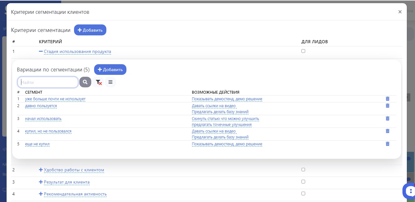 Также будет здорово, если ваша система сама сможет сегментировать клиентов по их активности в плане работы с ними.