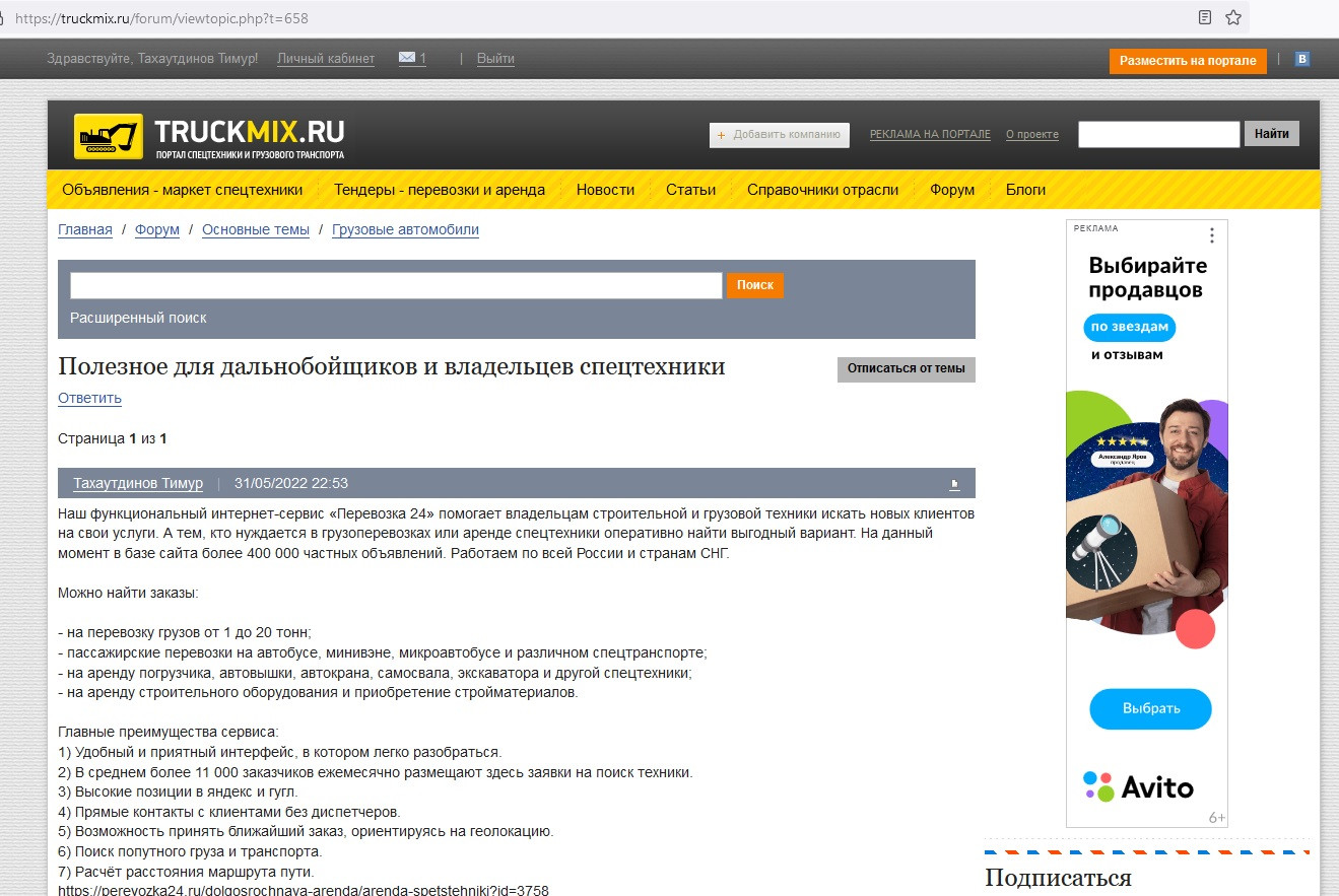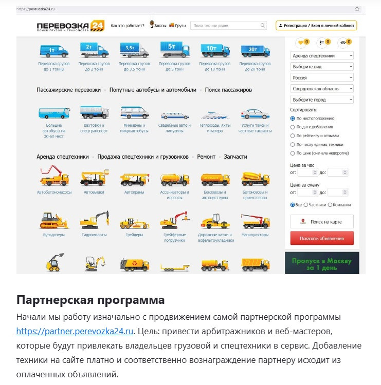Еще у меня есть опыт развития крупного сервиса для владельцев спецтехники «Перевозка 24». Полную статью читайте на нашем Dzen канале , где я подробно описываю все источники трафика и методики продвижения.