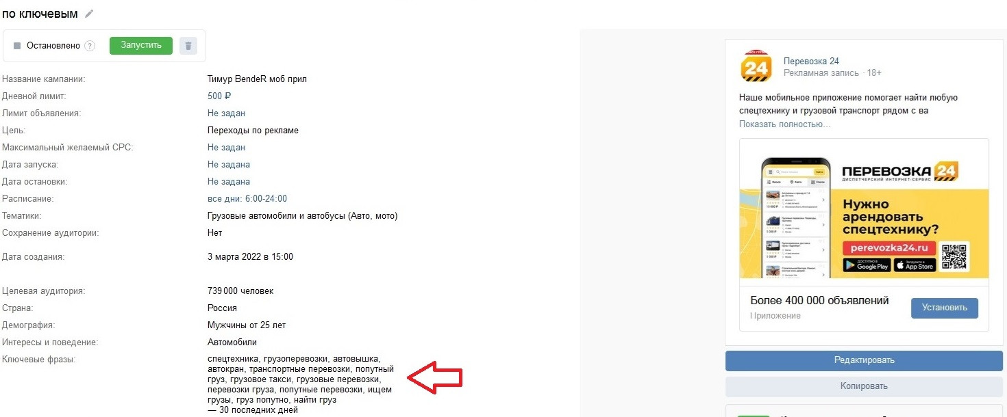 Да... Кейс не свежий и сейчас рынок рекламы настолько изменился, что к таким цифрам прийти будет просто невозможно. Но на всякий случай опубликую некоторые результаты полугодового сотрудничества с компанией «Перевозка 24». Для начала нужно определиться, что вы сами конкретно ждете от интернет продвижения и маркетинга в целом? Если нужны просто продажи любым путем, по самой низкой цене и с самым низким бюджетом, то это, во-первых, не к нам. А во-вторых, небольшую сумму за работу ставят либо новички в маркетинге (и работают с микробюджетами), либо недобропорядочные специалисты, которые могут слить бюджет, например. Мы относимся к работе ответственно, предоставляем качественные услуги и наш прайс не самый низкий, т.к. обусловлен 8-ми летним опытом. Знаем много тонкостей, о которых не расскажут даже крупные рекламные агентства в РФ. Статью старался написать максимально простым и понятным языком для предпринимателей и владельцев компаний, занимающих тяжелой техникой. 1. Таргетированная реклама в соц. сетях Из разрешенных площадок сейчас в РФ остались основные игроки — Вконтакте и Телеграм. С помощью таргета Вконтакте можно привлекать заявки как в свое сообщество, так и сразу на сайт. Примечание: — сайт или сообщество в соц. сети должны быть хорошо упакованы; — иметь современный дизайн и качественный фото / видеоконтент; — должны быть удобная навигация и понятные разделы; — на видном место нужно разместить полную и достоверную информацию о компании. Т.е. сам таргет будет просто бесполезен, если он настраивается на устаревший сайт или в совсем «мертвое» сообщество. В данный момент ВКонтакте есть реклама в новостных лентах. Например, можно показываться на аудиторию прямых конкурентов (т.е. сообщества, которые уже развили свои соц. сети до определенного уровня и можно перетянуть их клиентов). Еще можно настроить показы по ключевым словам: «спецтехника купить», «сайт спецтехника», «компания по продаже спецтехники», «аренда крана», «бренды Китайской техники» и подобные. Т.е. алгоритмы будут показывать рекламный пост тем, кто искал нужные нам фразы в этом месяце. Также Вконтакте позволяет настроить рекламу по должностям. Условно можно показывать рекламное предложение руководителям или коммерческим директорам производственных компаний. Таких людей в соц. сетях не так много, но они все равно есть. Рекламный месячный бюджет для Вконтакте нужно заложить хотя 40 000 руб. В новых рекламных кабинетах еще и есть НДС 20%. Т.е. условно даже с этих 40 000 руб. сам налог будет 8 к. Оптимально заходить в таргетинг Вк при месячных вложениях от 100 000 руб. Если рассчитать, то это всего чуть больше 3 000 руб. в день, а в текущем высококонкурентном рынке это не так много. Теперь про таргетинг в Телеграм. Он есть, но работает очень криво и там очень мало настроек. Скорее это реклама для охвата, для узнаваемости и подойдет только крупным брендам, которые работают на всю Россию. С бюджетами меньше 100 000 руб. в месяц в Telegram ADS (так называется таргетинг в телеграм) делать нечего. В таргетированной рекламе Телеграм есть всего две настройки: по тематикам открытых каналов (выбираем тему и платформа сама подберет каналы, в которых будет показана наша реклама) и по конкретным каналам (обычно выбирают каналы прямых конкурентов). Но в таргетированной рекламе Телеграм нельзя корректно пос