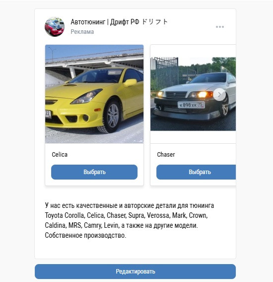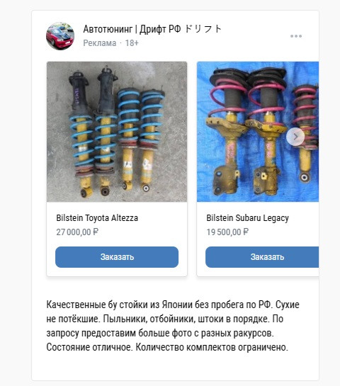 Условно, если пробовать сразу рекламироваться по ключевым фразам «автотюнинг магазин» или «магазин автозапчастей», то сразу сталкиваемся с очень высокими ставками в рекламе и не особо целевым трафиком. Тем более на такие широкие запросы большая конкуренция и поэтому цена за клик, подписку, переход и заявку будет довольно высокая. Другое дело, если нужен брендовый трафик или просто подписчики и есть соразмерный бюджет на это (явно свыше 100 к в месяц). На примере та самая карусель товаров. Можно добавить либо марки, либо подборки товаров, либо отдельные автозапчасти (желательно те, на которые больше спрос и не с самым низким чеком).