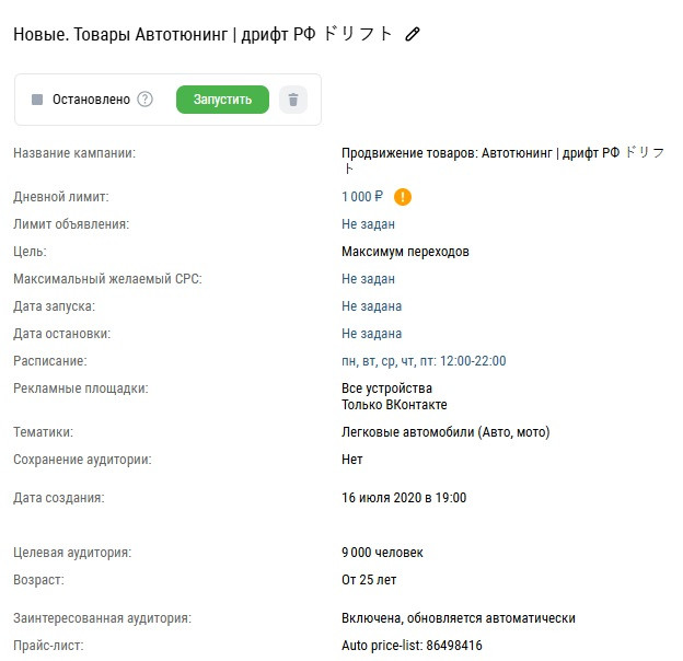 Здесь пример настройки нашей рекламы Вконтакте для автотюнинг магазина.