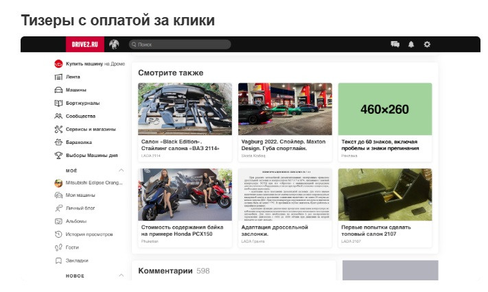Оплата рекламы тут либо за клики, либо за 1000 просмотров. Конечно, какой-то оптимизации на конверсию вы не найдете. Если рассматривать крупные баннера на главной странице это больше пиар история на узнаваемость, а не на продажи (или продвижение каких-то автокредитных программ, или акций крупных интернет-магазинов). А вот ведение своего бизнес блога и продвижение отдельных постов — как раз можно использовать для продаж в любом автобизнесе (не обязательно быть крупным брендом).
