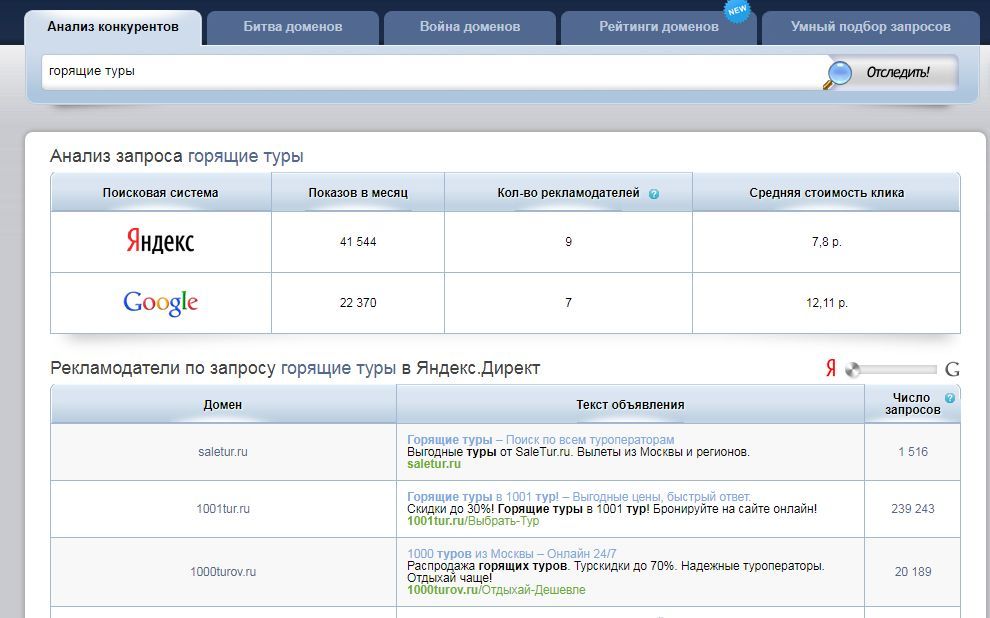Эти данные предоставит сервис SpyWords. Информация поможет вам не сливать бюджет, а взять лучшие решения конкурентов и сформировать на их основе свою стратегию и получить больше клиентов за адекватные деньги.