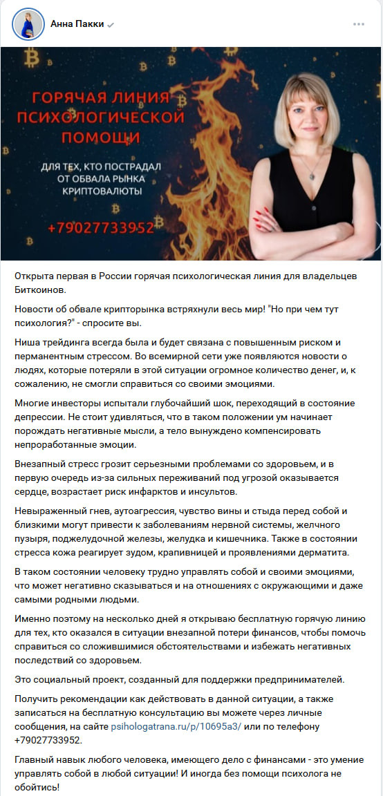 Что важно отметить — это инициатива практикующего психолога, направленная на срочную эмоциональную поддержку людей, пострадавших от падения курса криптовалют. Анна прямо указывает, что цель — помочь справиться с эмоциями, снизить риск усугубления психосоматических проблем и дать рекомендации по дальнейшим шагам.